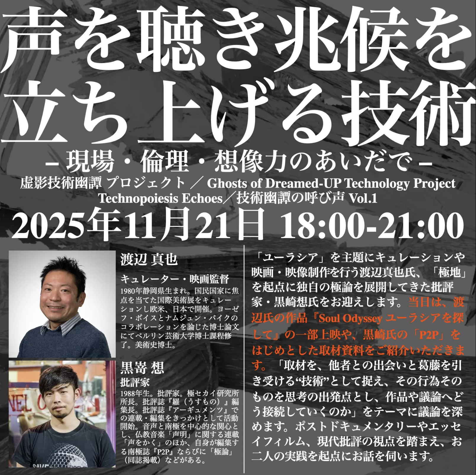 「ユーラシア」を主題にキュレーションや映画・映像制作を行う渡辺真也氏、「極地」を起点に独自の極論を展開してきた批評家・黒嵜想氏をお迎えします。当日は、渡辺氏の作品『Soul Odyssey ユーラシアを探して』の一部上映や、黒崎氏の「P2P」をはじめとした取材資料をご紹介いただきながら「取材やリサーチを、他者との出会いと葛藤を引き受ける“技術”として捉え、その行為そのものを思考の出発点とし、作品や議論へどう接続していくのか」をテーマに議論を深めます。ポストドキュメンタリーやエッセイフィルム、現代批評の視点を踏まえ、お二人の実践を起点にお話を伺います。